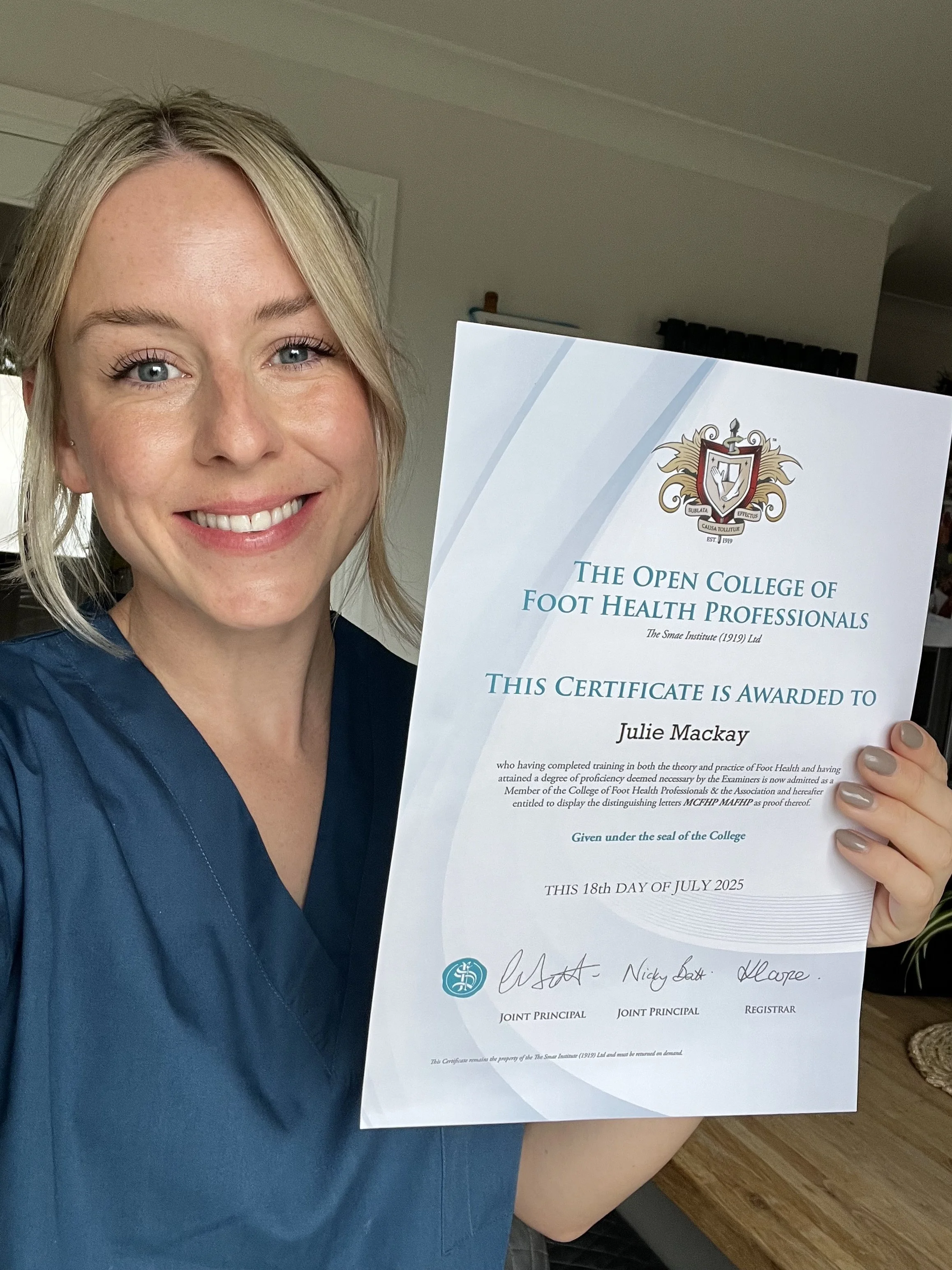 Hello, my name is Julie Mackay Dip FH, MCFHP MAFHP. I am a Foot Health Practitioner. I studied with SMAE Institute in Maidenhead.